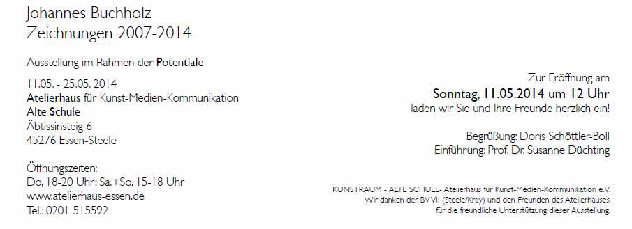 Johannes Buchholz, in Essen geboren und in Bochum aufgewachsen, lebt in Berlin und ist künstlerischer Mitarbeiter an der Universität Duisburg-Essen. Eine Auswahl des Schaffens der letzten Jahre ist nun im Atelierhaus - Alte Schule-  in Essen-Steele zu sehen.